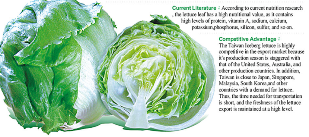 The Taiwan Iceberg lettuce is highly competitive in the export market because it’s production season is staggered with that of the United States, Australia, and other production countries. In addition, Taiwan is close to Japan, Singapore, Malaysia, South Korea, and other countries with a demand for lettuce. Thus, the time needed for transportation is short, and the freshness of the lettuce export is maintained at a high level.
